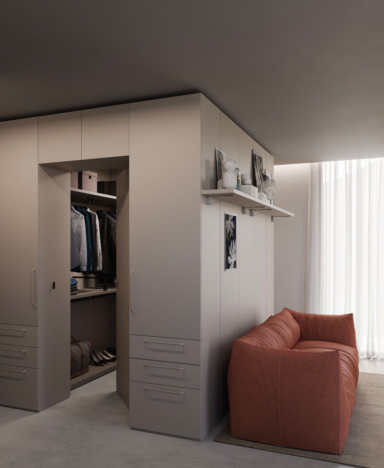 The art of storage. Modular wardrobes and walk-in wardrobe. With flexible dimensions, they can be adapted to suit the specific needs of the space.